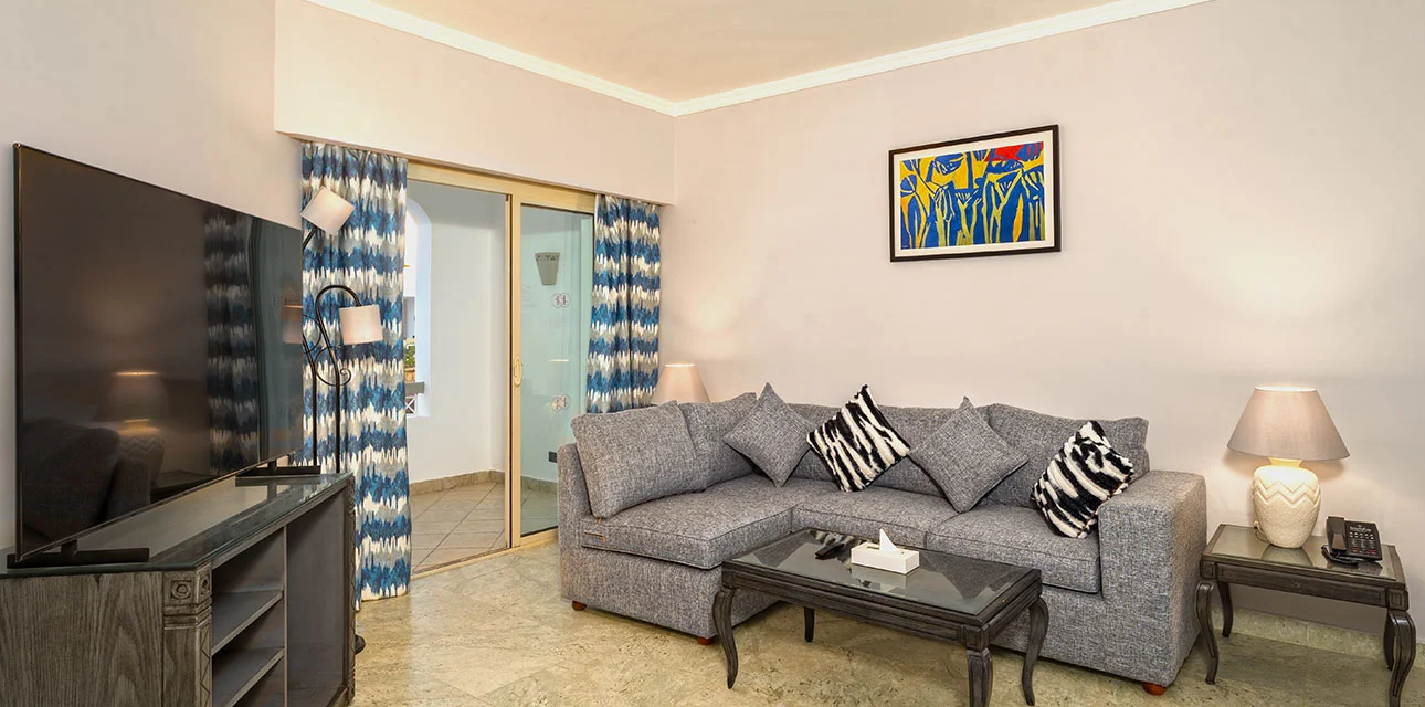 The suite features an elegant master bedroom with a seating area, along with a separate living room that includes a spacious lounge, dining area, and private bar — providing the perfect setting for unwinding, entertaining, or enjoying quality family time. Guests can also relax on their private terrace or balcony, which offers a refreshing pool view, adding a bright and vibrant resort atmosphere to the experience.